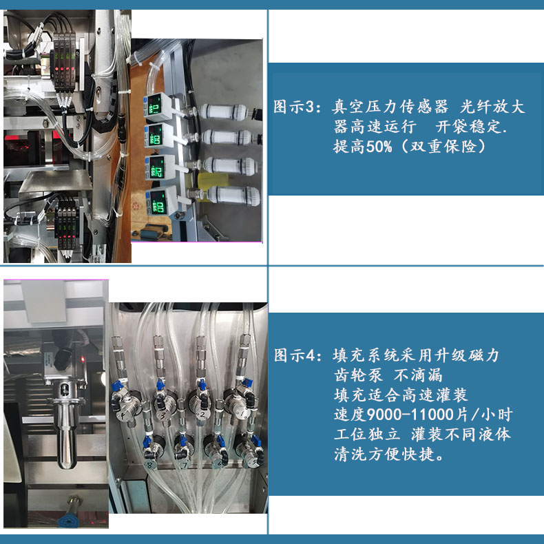2.全自動(dòng)面膜機(jī): | 充填精華液,再對(duì)充填完精華液的面膜袋進(jìn)行封口和打碼。 |