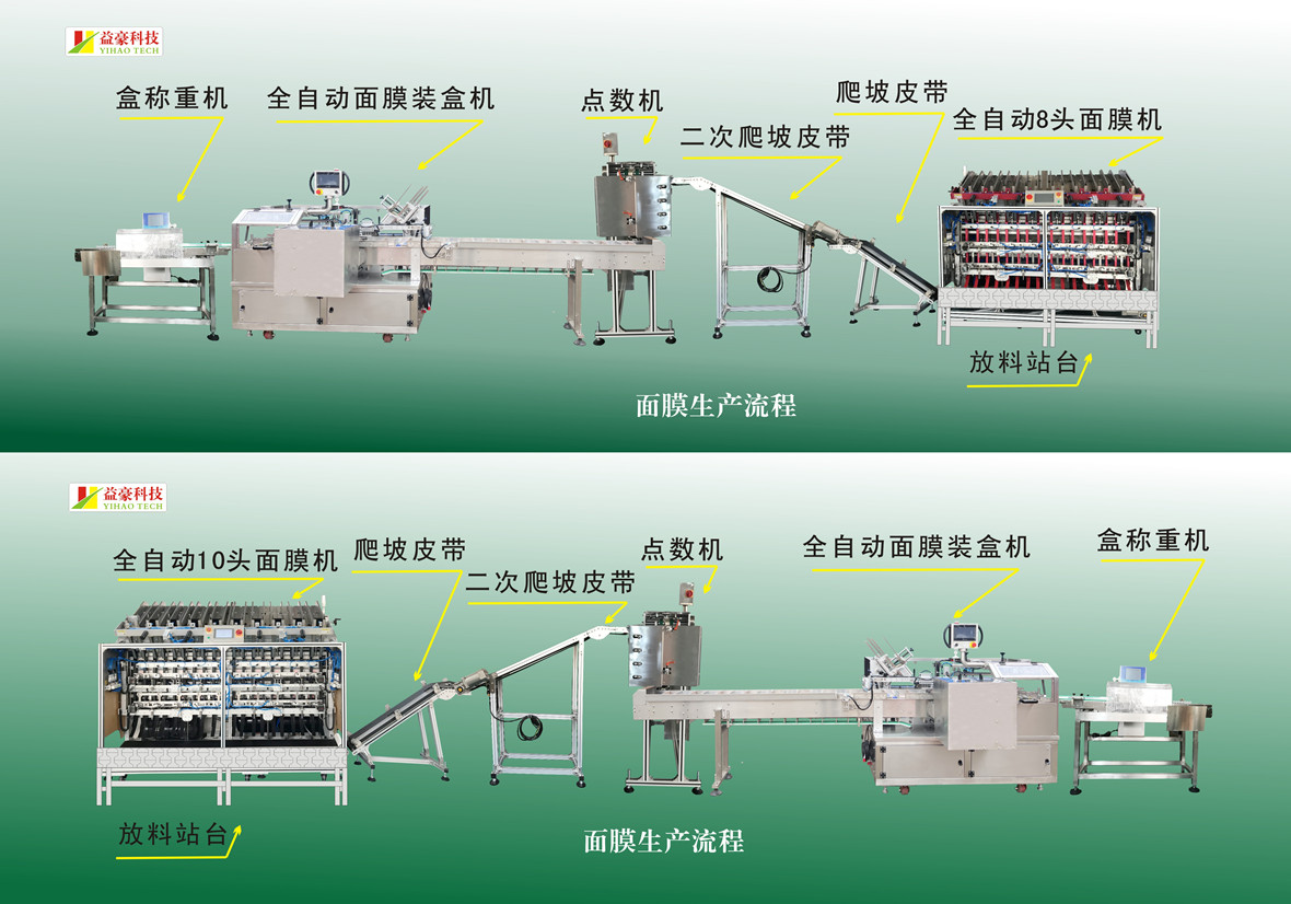 整線流程:面膜自動(dòng)充填一封口一輸送一自動(dòng)點(diǎn)數(shù)-自動(dòng)裝盒-自動(dòng)稱重一自動(dòng)塑封一成品收集,二次爬坡皮帶:整齊的把灌裝好的面膜輸送到面膜點(diǎn)數(shù)機(jī)上。面膜點(diǎn)數(shù)機(jī):對(duì)面膜進(jìn)行點(diǎn)數(shù)堆疊,并自動(dòng)放到裝盒機(jī)中。裝盒機(jī):對(duì)上一工序點(diǎn)數(shù)好的面膜自動(dòng)裝盒。